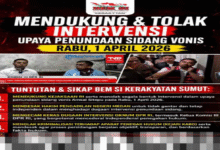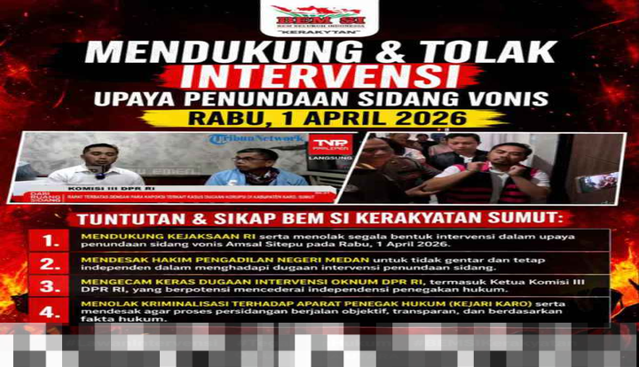 MEDAN – Badan Eksekutif Mahasiswa Seluruh Indonesia (BEM SI) Kerakyatan wilayah Sumatera Utara menyuarakan dukungan penuh kepada Kejaksaan Negeri Karo dan majelis hakim Pengadilan Negeri Medan dalam proses persidangan yang berkaitan dengan vonis Amsal Sitepu, terdakwa dalam kasus dugaan korupsi dana desa. Kasus ini menjadi sorotan publik, dan BEM SI menegaskan pentingnya kelancaran dan integritas dalam proses hukum yang sedang berlangsung.
