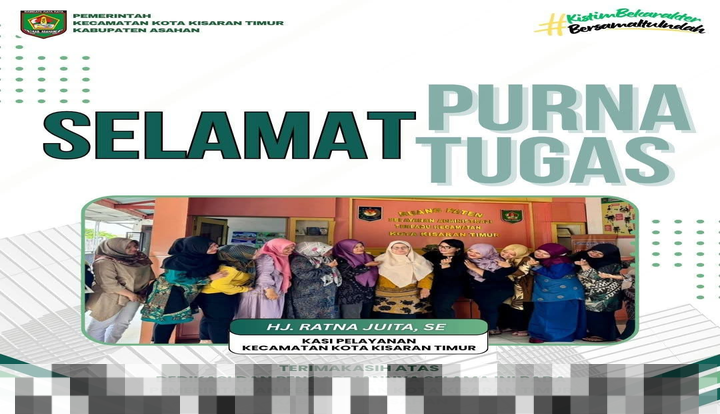 ASAHAN – Camat Kota Kisaran Timur A. Syaiful P. Pasaribu, S.AP.,MM beserta jajaran menyampaikan penghargaan dan apresiasi yang setinggi-tingginya kepada Ibu Hj. Ratna Juita, SE atas atas dedikasi, loyalitas, serta pengabdian yang tulus dan penuh tanggung jawab selama menjalankan amanah jabatan sebagai Kepala Seksi Pelayanan pada Kantor Camat Kota Kisaran Timur.